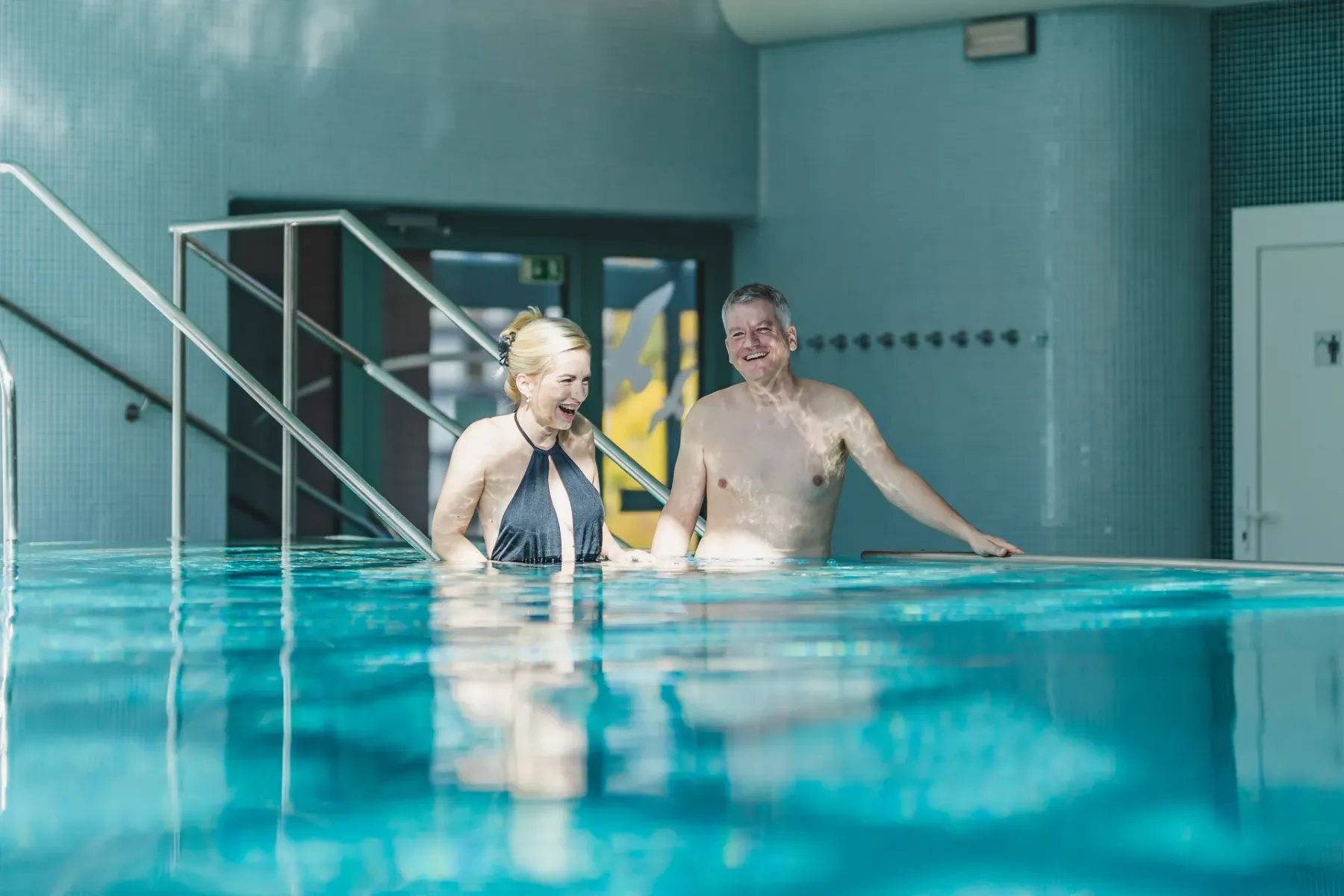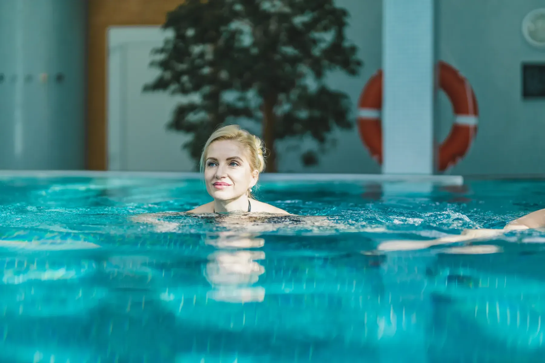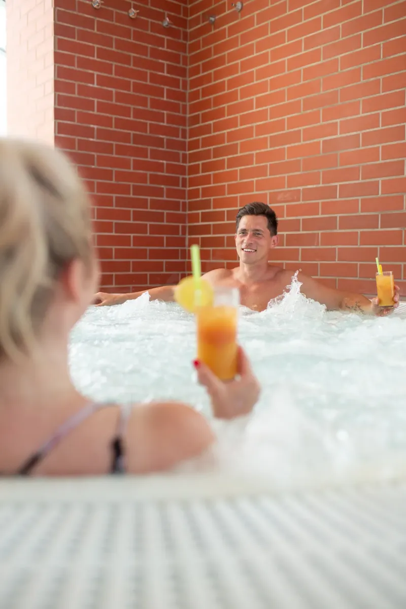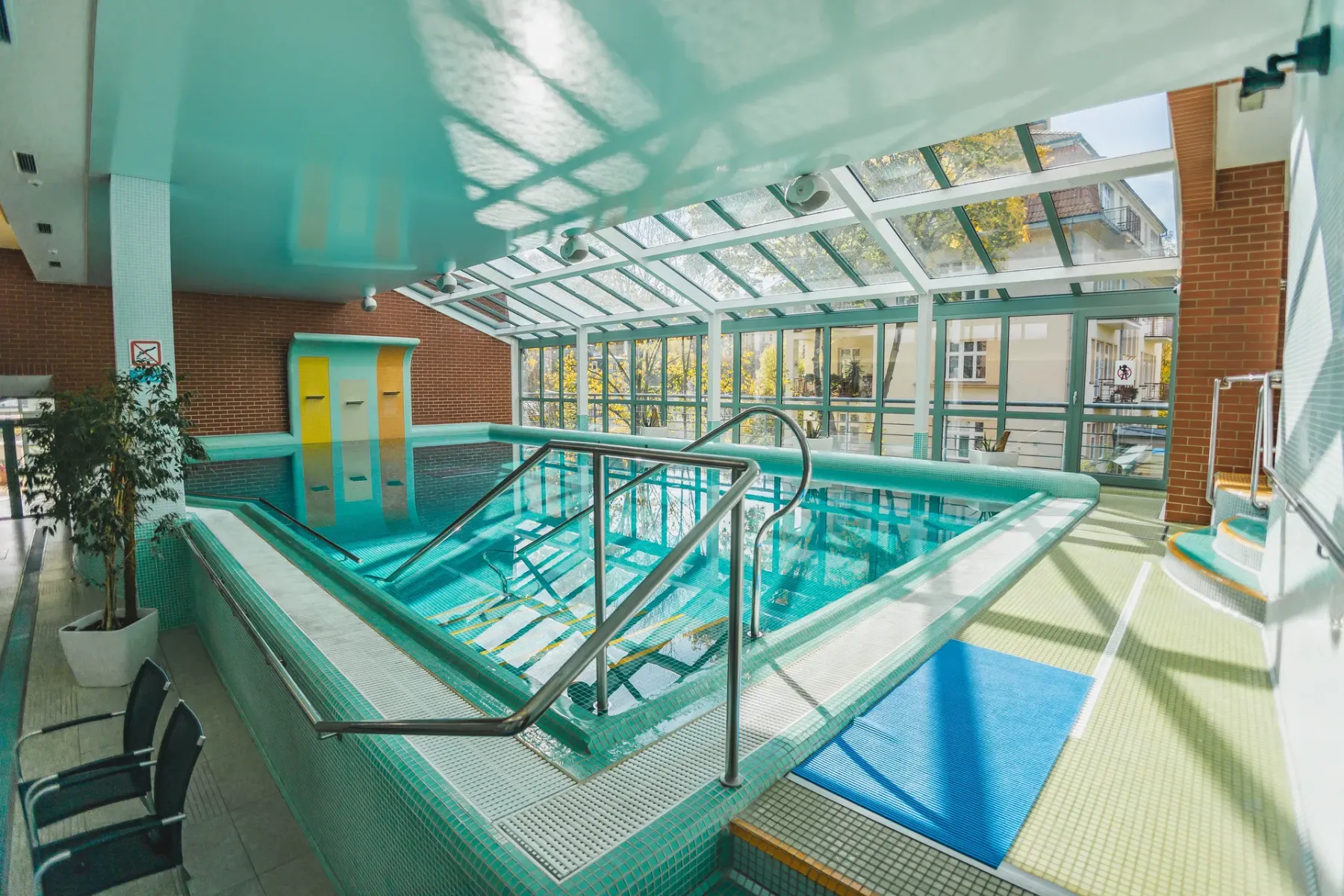 • Indoor pool with attractions and counter-current under a glass roof (29°C, 15×6 m)