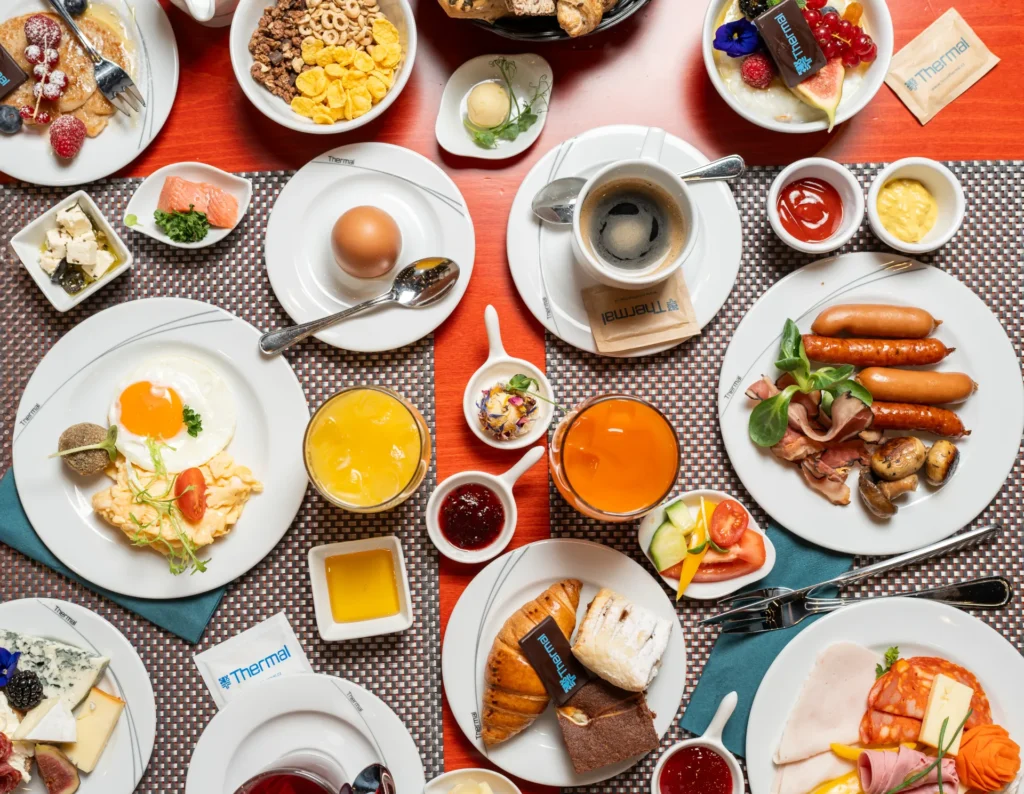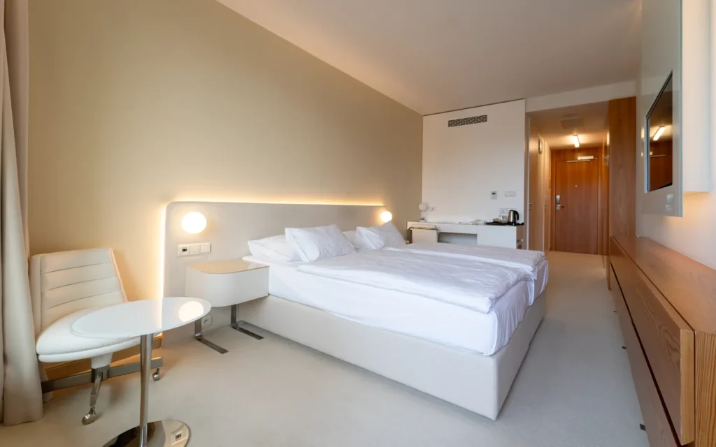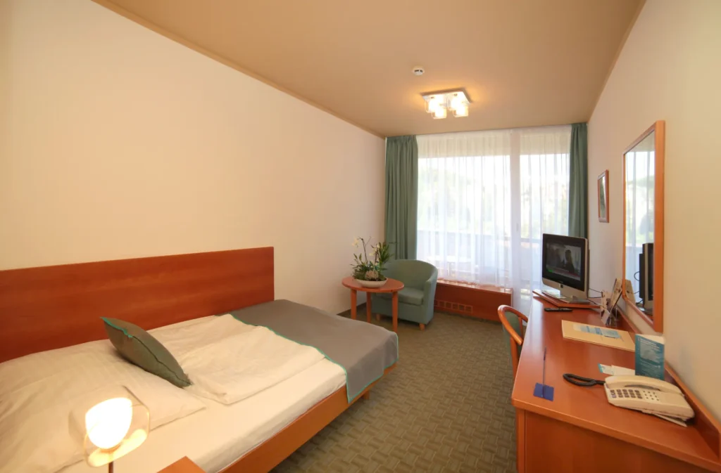 The hotel seamlessly connects to Saunia Thermal Resort, allowing guests to glide between accommodation and spa—every day includes access to pools, saunas, and treatments within one complex.