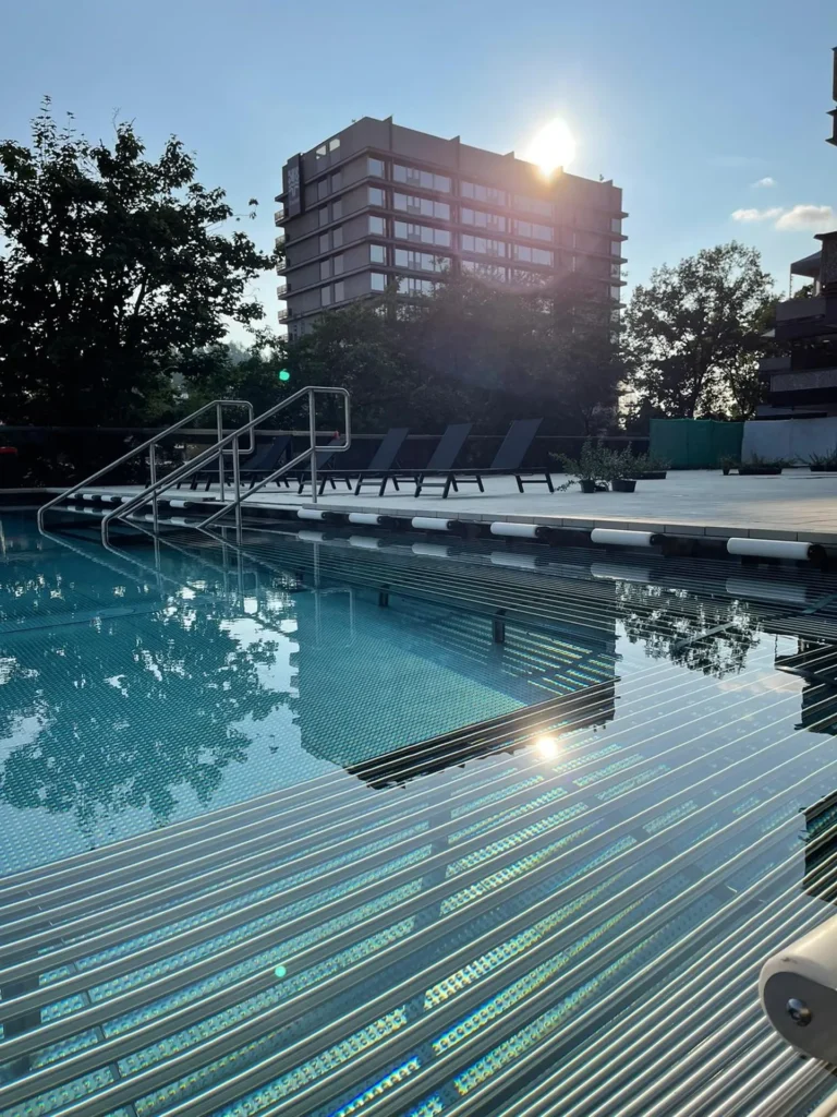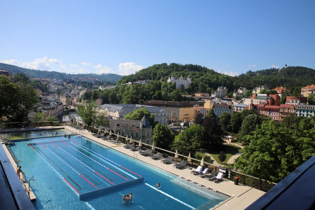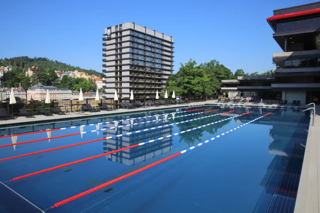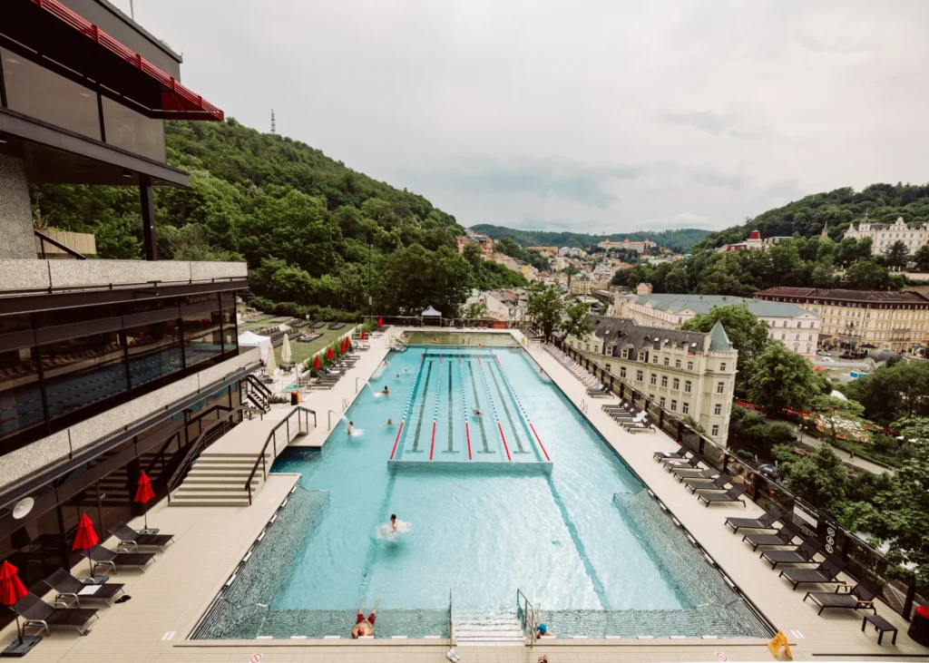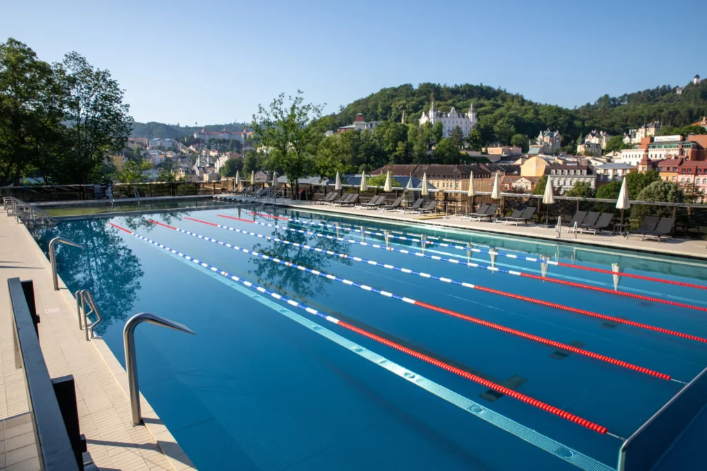 The outdoor and indoor thermal pools are filled with Vřídlo spring water, consistently maintained at 38 °C. The outdoor section offers traditional swimming lanes and a warmer, therapeutic pool.